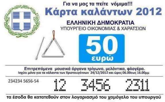 Η κάρτα καλάντων κυκλοφορεί από τα Χριστούγεννα και η αξία της είναι 50 ευρώ! Όποιος το έφτιαξε έχει πιο διεστραμμένη φαντασία απ' όση έχουν 3 υπουργοί Οικονομικών μαζί!
