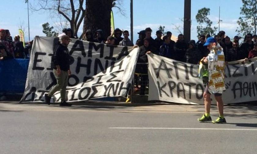 Πήγαν στον τερματισμό του 13ου Διεθνούς Μαραθωνίου "ΜΕΓΑΣ ΑΛΕΞΑΝΔΡΟΣ", για να διαμαρτυρηθούν. Ο λόγος για οπαδούς του ΠΑΟΚ, οι οποίοι κρατούσαν πανό το οποίο έγραφε "Grexit is the only solution".
